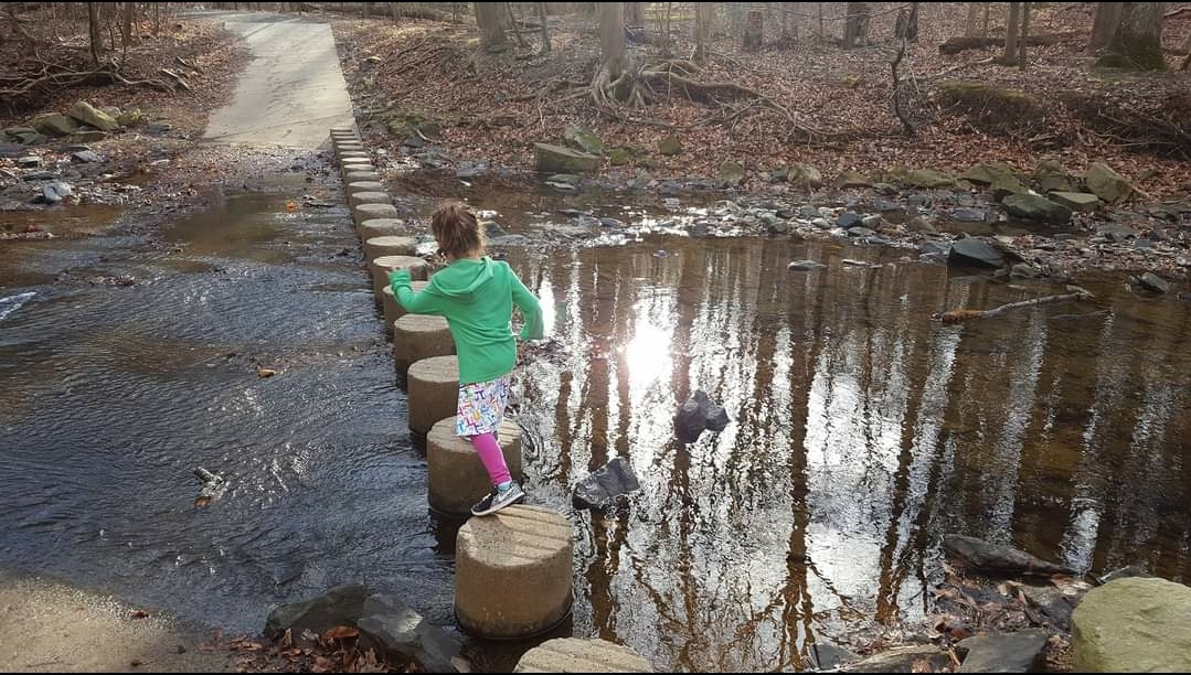 So many of our outdoor adventures take place along the Potomac River, and Scott’s Run is no exception. Located in McLean, VA, just up the road from Clemyjontri Park, this Nature Preserve is composed of a network of trails that lead to the river via a patch of hilly woodlands. Its namesake is Scott’s Run, the creek that winds through the preserve until it reaches the Potomac, where it tumbles over the rocky banks in a charming waterfall. The Nature Preserve can be accessed via two small parking lots on Georgetown Pike, and we prefer the larger of the two, which is located at the intersection of Swinks Mill Road and Georgetown Pike. After parking there, follow the flat trail to the right of the creek. At two different points, the creek will cut through the trail, requiring you to hop across it on a series of manmade stepping stools. After you make your way across the water the second time, hike up the hill in front of you. When you get to the top, walk down the hill via the wide stony trail on the left. At the base of the hill, you will find the waterfall, some fun rock scrambling spots, and lovely views of the Potomac.