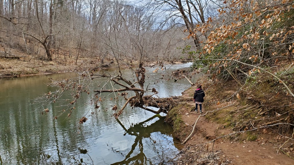 Located just 10 minutes from historic downtown Leesburg, Red Rock Wilderness Overlook Regional Park feels like a completely different world. The 67-acre park is home to several trails that wind through the forest to a bluff, offering sweeping views of the Potomac River. We stuck to the blue and white trails while we were there (which only separate from each other for a brief period near the overlook before reconnecting), but we were also among the brave souls that climbed down the hillside to the water’s edge. The scramble back up to the trail was easier said than done – at least for me; my kid scampered up it like a gazelle while I slid around ungracefully and tried not to fall in the mud. The grounds are also home to a several historic structures with interpretive signs. This is a fantastic park for a fun family hike.