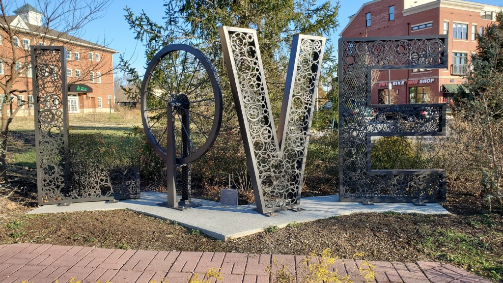 Leesburg is actually home to two LOVEworks, but we have only visited one so far. Located along the W and OD trail and in plain view of Transition Triathlon, this sign’s cycling theme makes a lot of sense. However, I was surprised to learn that the gears seen in the design are real bike parks that were donated by local cycling shops – how cool is that?! This LOVEwork sign is a great stopping point if you are taking a stroll on the trail or letting the kids run around in the pretty park right across the street.