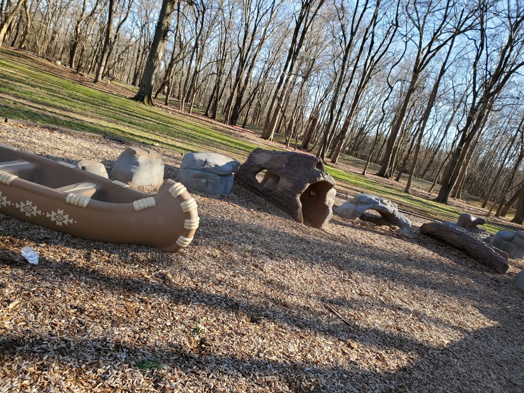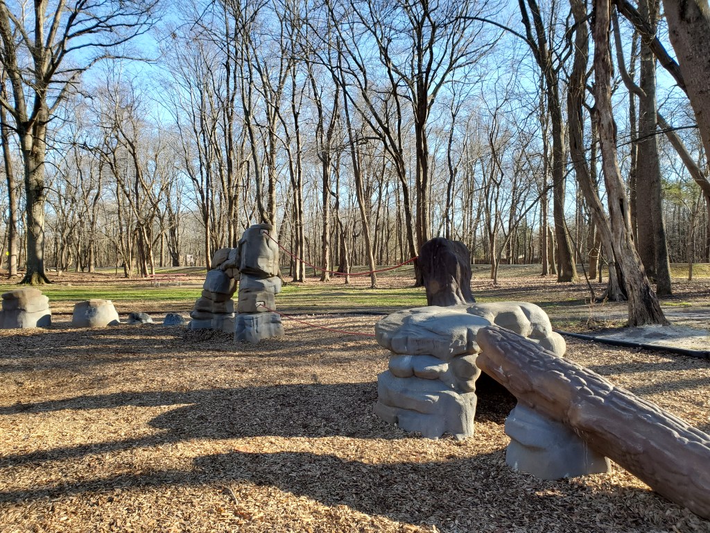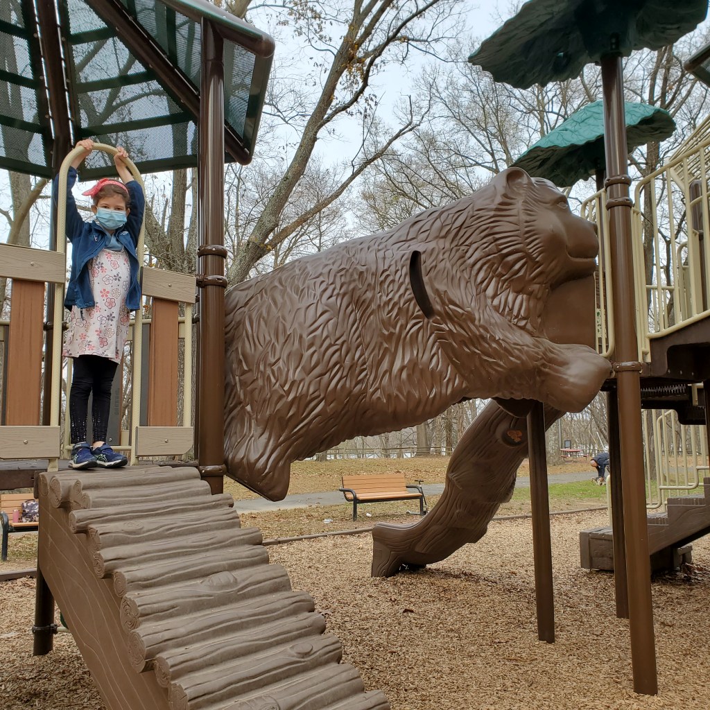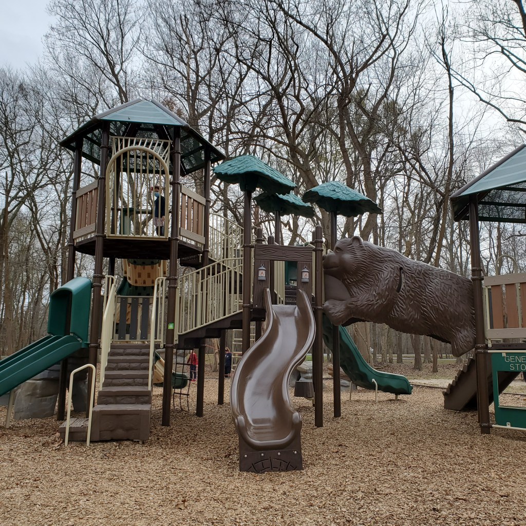 Those who read have read past blog posts know that I am a fan of parks and hiking opportunities along the Potomac River, and for that reason, Algonkian Regional Park does not disappoint. In addition to scenic trails, a golf course, cabin rentals, and Volcano Island Water Park, this riverfront park is home to one of our favorite playgrounds. Designed with a woodland theme, the playground features low-to-the-ground balance structures that look like stones and logs, complete with a hollowed out canoe and a slackline. The large climbing structure features a scramble tunnel obscured by a bear sculpture. The swing set has traditional swings, as well as a unique baby-big kid swing combo. I’m looking forward to trying this out when Daughter #2 can sit up!
