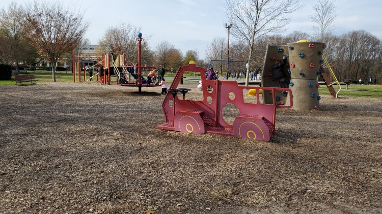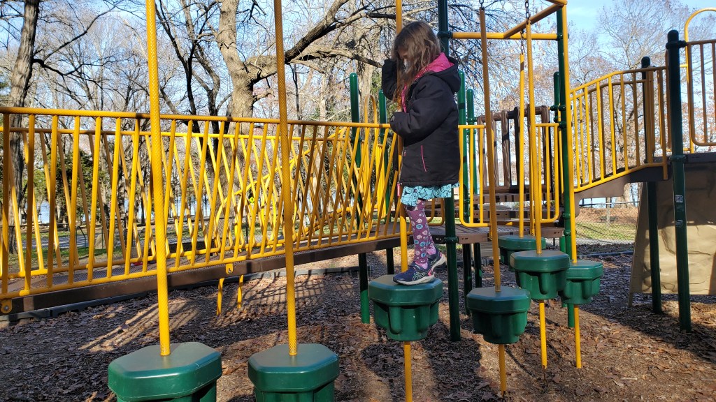 Van Dyck Park has been a fun destination for my family since my older daughter was just a few years old. My husband and I loved taking her here because the park is surrounded by a running/fitness trail, so we used to take turns entertaining her while the other person worked out. The park is also home to an expansive field, tennis courts, beach volleyball courts, and a skate park, but the playground has always been the main attraction for us. This park often gives the illusion of being less crowded than it actually is because it is divided into a series of what we call “islands”. The equipment was installed in small clusters, and each cluster of equipment is spaced a significant distance away from the next cluster. This drastically reduces the number of children on each structure – and often when we go there are few to no other children on the structure where my daughter chooses to play at any given time.