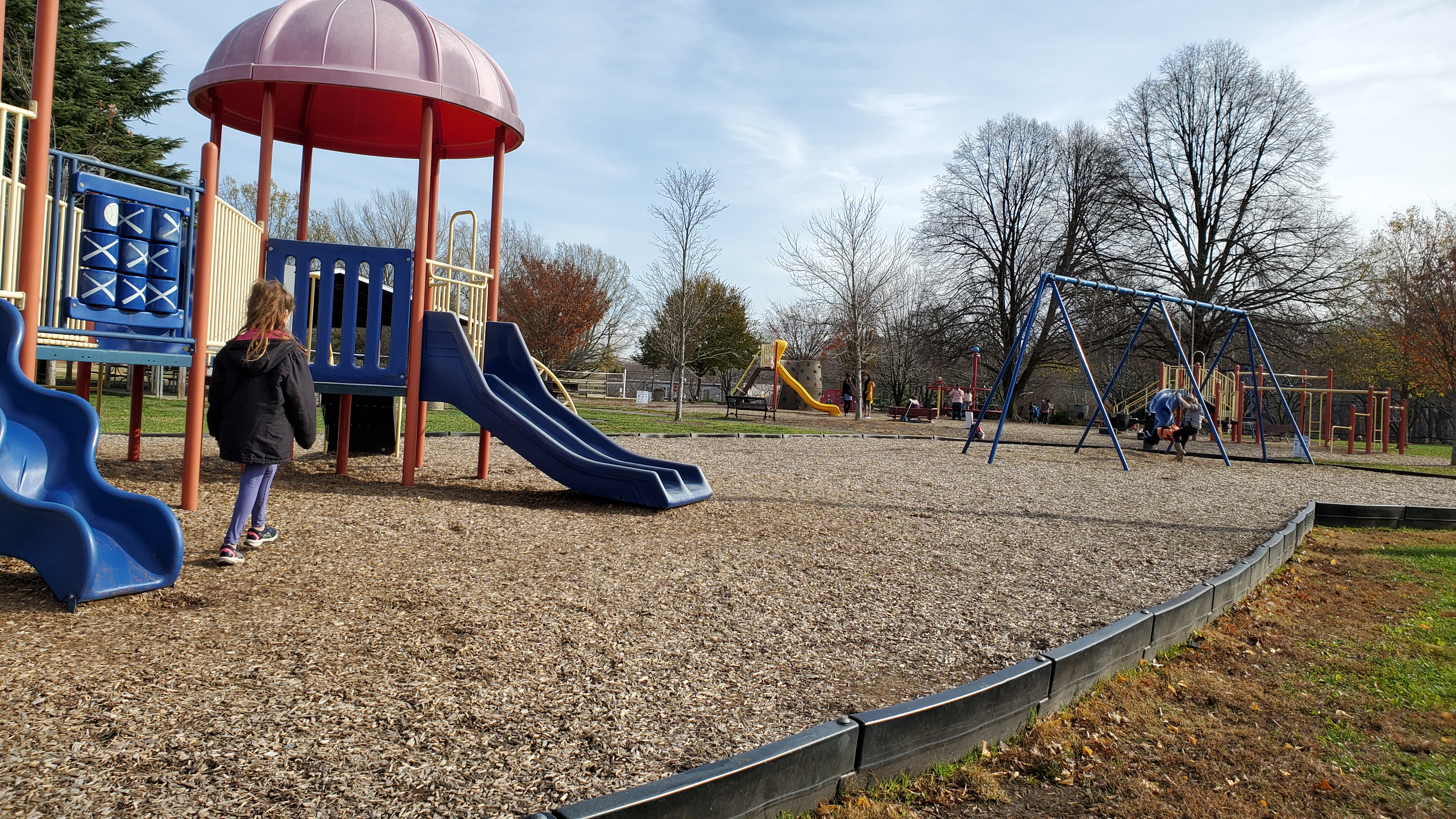 We just recently discovered this Herndon town park when we were out for a drive on New Year’s Eve. Located about 10 minutes from our home, we spotted the colorful, modern play structure from the road and immediately pulled in to the parking lot. This park probably has the newest playground on the list, and it boasts some very neat equipment. There are unique climbing structures, a fun spinning platform, and decorative features that cast rainbows on the ground while offering a bit of shade from the sun. The park is also home to two baseball diamonds, a soccer field, a beach volleyball court, picnic tables, and seasonally open bathrooms.