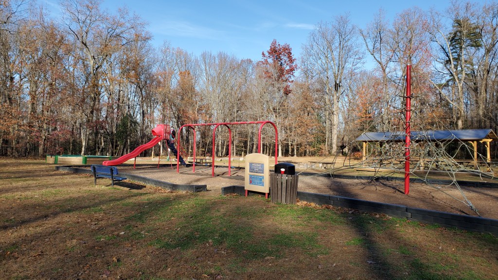 The picnic shelter seen above is right next to the playground, making it a popular place to hold birthday parties. It is also a nice spot to enjoy a pizza pie from Village Grill, a restaurant just across the street (in addition to pizza, they make the best falafels I’ve ever had!). For dessert, you can head to Great Falls Creamery, which is just a few blocks away. If you want to turn your visit into a longer adventure, the adorable Great Falls Library is right next door to this playground, and both Riverbend Park and Great Falls Park are just a few minutes down the road (you can read more about Great Falls and how to hike there from Riverbend in an older blog post here).
