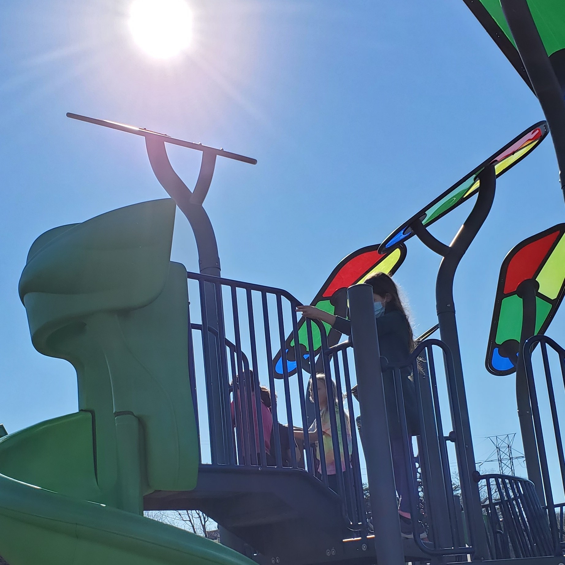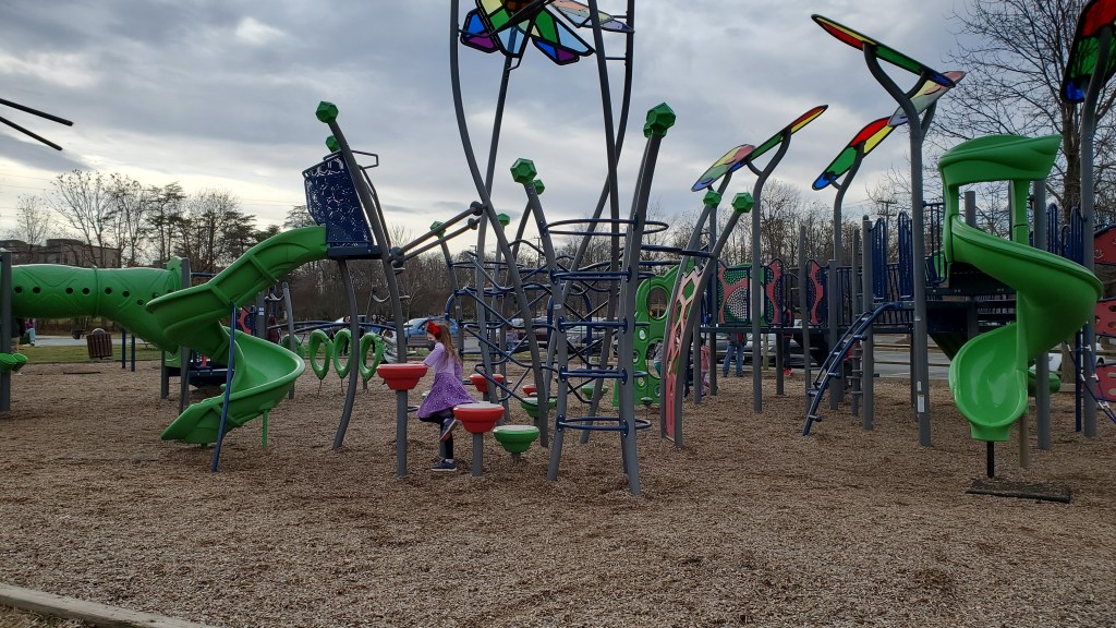 The weather is finally starting to get warmer! While I don’t necessarily mind being out and about in more frigid temperatures, Daughter #2 has made it very clear that she is not a fan of winter. For that reason, watching the thermometer climb has gotten me super excited about returning to some of our favorite outdoor locations. While we definitely have some hikes and day trips on the agenda, we are starting small by revisiting some of our favorite playgrounds.