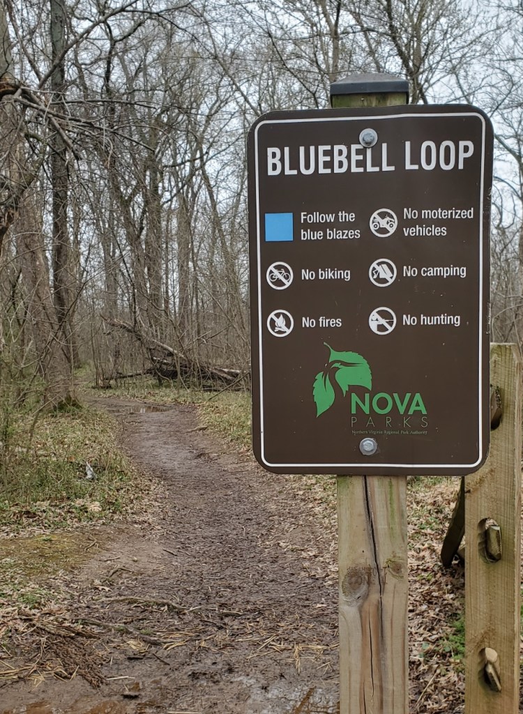 The Bluebell Trail is a flat 1.5 mile loop through the forest of Bull Run Regional Park. The address listed above is for the park itself, but if you enter “Bluebell Trail, Centreville, VA” into your GPS, it should take you more or less directly to the trail. If not, you can spot the well-marked entrance to it on your right shortly before reaching the Atlantis Waterpark parking lot on your left. You can certainly park in the Atlantis lot, but I wound up making a U-turn and parking in the lot I passed just before the Bluebell trailhead because that seemed a bit closer to me.