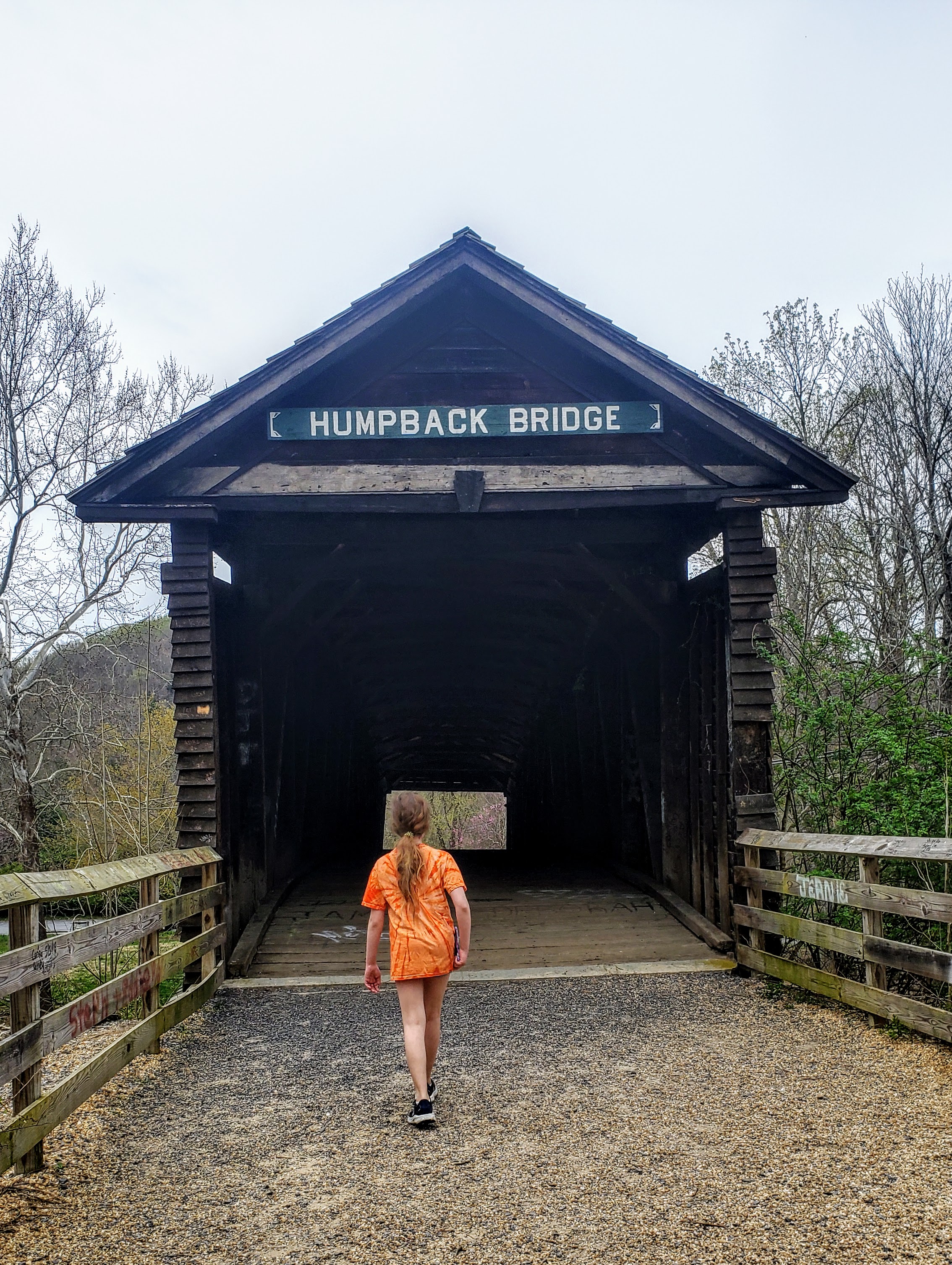 The characters’ final stop of the day is less than 20 minutes from Falling Spring Falls. Spanning the width of Dunlap Creek, Humpback Bridge is a little over 100 feet in length and is the only bridge of its kind (both covered and humpbacked) left in the country.