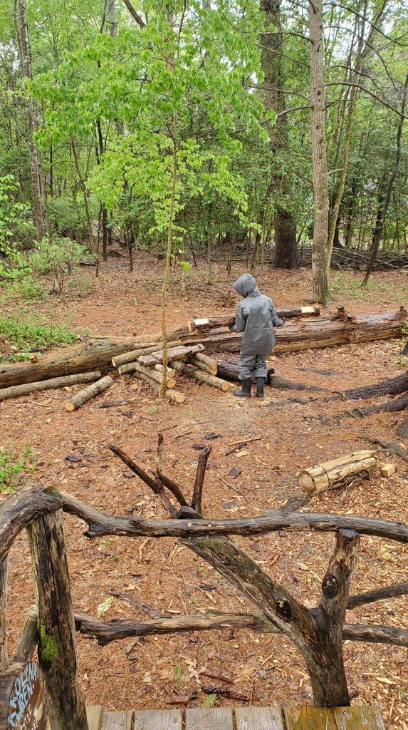 Last but certainly not least, we visited Boxerwood Gardens for the very first time, and this place was magical. A $5 donation per vehicle gains you access to a beautiful garden, as well as a spectacular enclosed play trail for children ages eight and under. It happened to be raining pretty consistently when we were there, so we suited up and spent about an hour exploring with the place all to ourselves. I let my 12-year-old play a bit because no one else was there, and because she wanted to construct a fort for her sister. Daughter #2 was perfectly happy to try out the mud kitchen and build block towers inside of the human-sized birdhouse. I cannot wait to revisit this place in nicer weather.