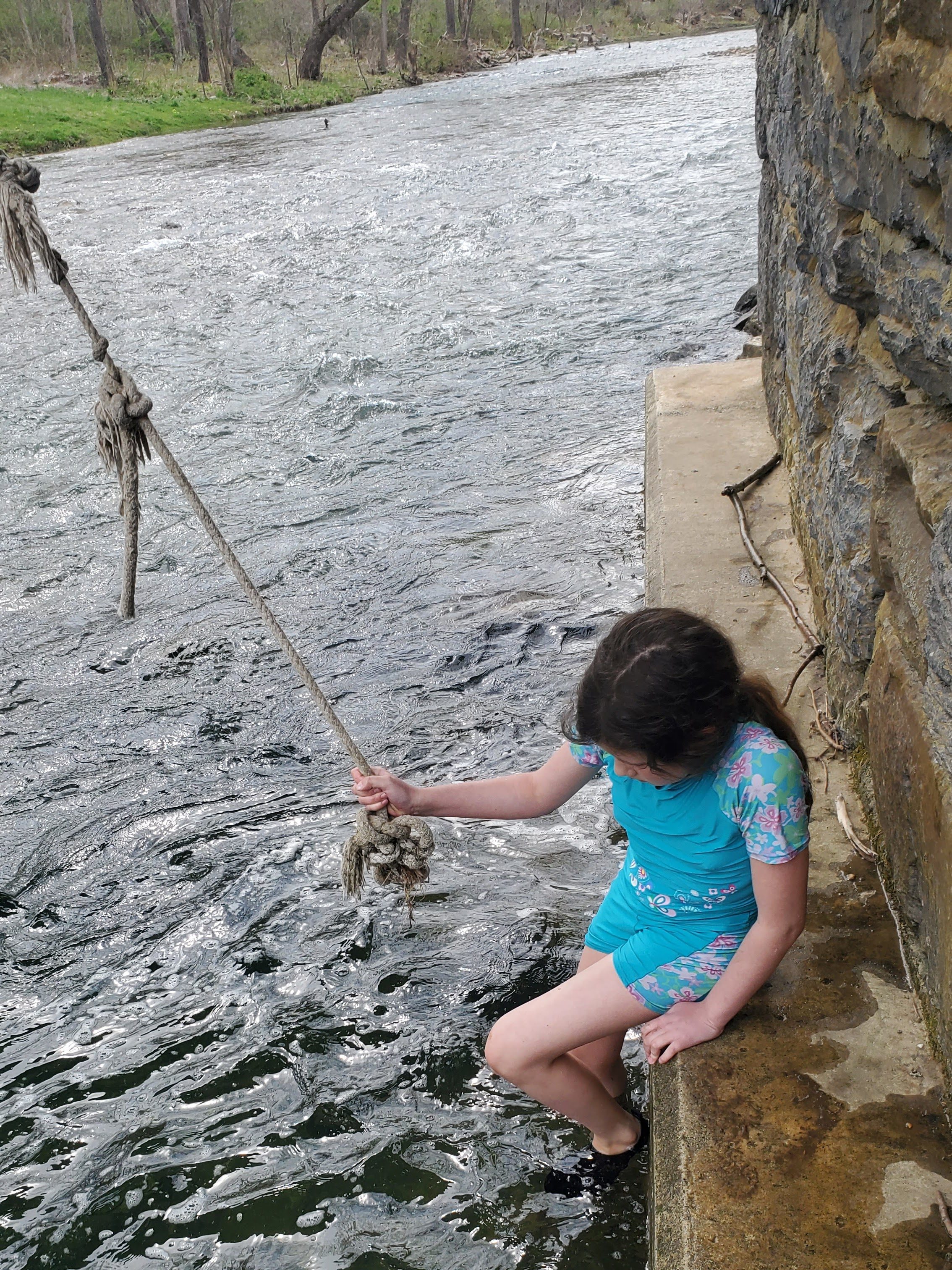 In a sweet stroke of luck, the creek deepens and swells right under the bridge, and a rope swing has been tied to the bridge’s underside. The swinging rope creates a thrilling jump into a bona fide swimming hole. It was rather chilly when we were there, but Daughter #1 braved the water for a few minutes anyway.