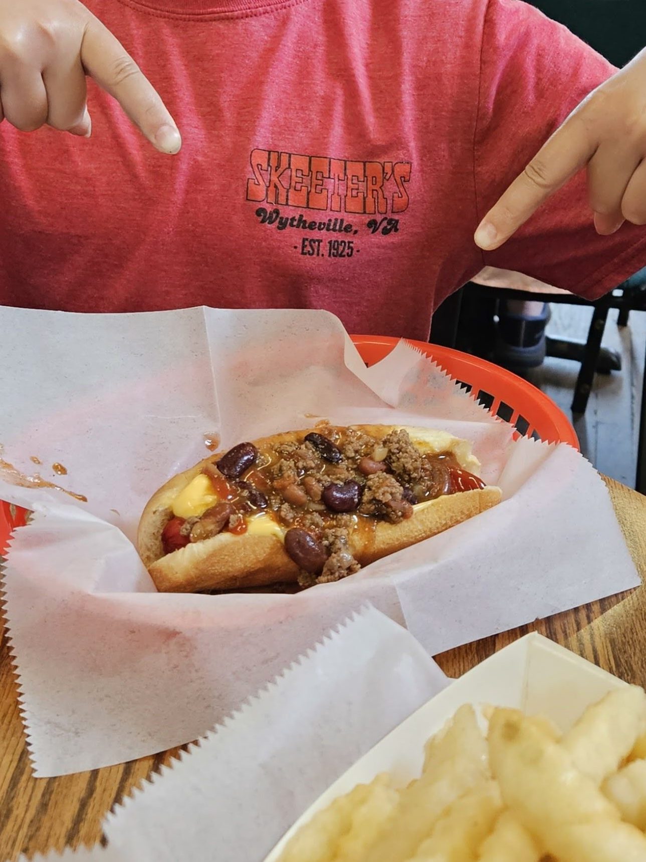 A local institution, Skeeter’s has been selling its famous hotdogs for nearly 100 years. In Chapter 1 of Virginia is for Adventurers, Meg expresses her love for Skeeter Dogs, so I knew we would be stopping by. My daughter was particularly excited to eat there because Tara Z. Fisher had surprised her with a Skeeter’s t-shirt during an author visit at her school, and she was wearing it for our Wytheville excursion. The delightful employees noticed it and joked that they were going to put her to work, which she found very funny.