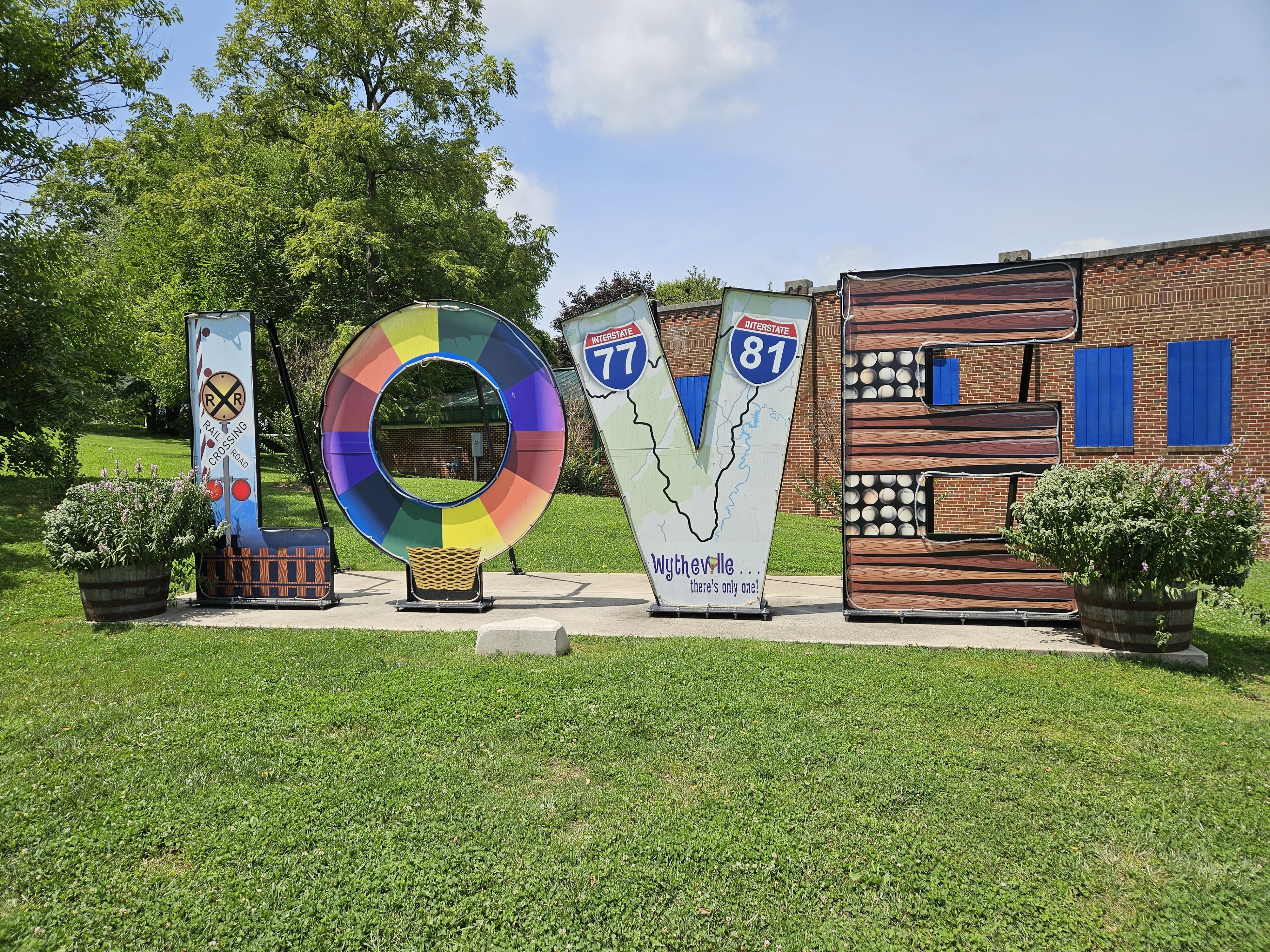 Eventually, we reached the large LOVEwork in front of Wither’s Park and near the town’s public pool. The art installation pays homage to the area’s railroad history, the hot air balloon painted on Wytheville’s water tower, the intersection of two important highways, and the significance of baseball in the town’s history.