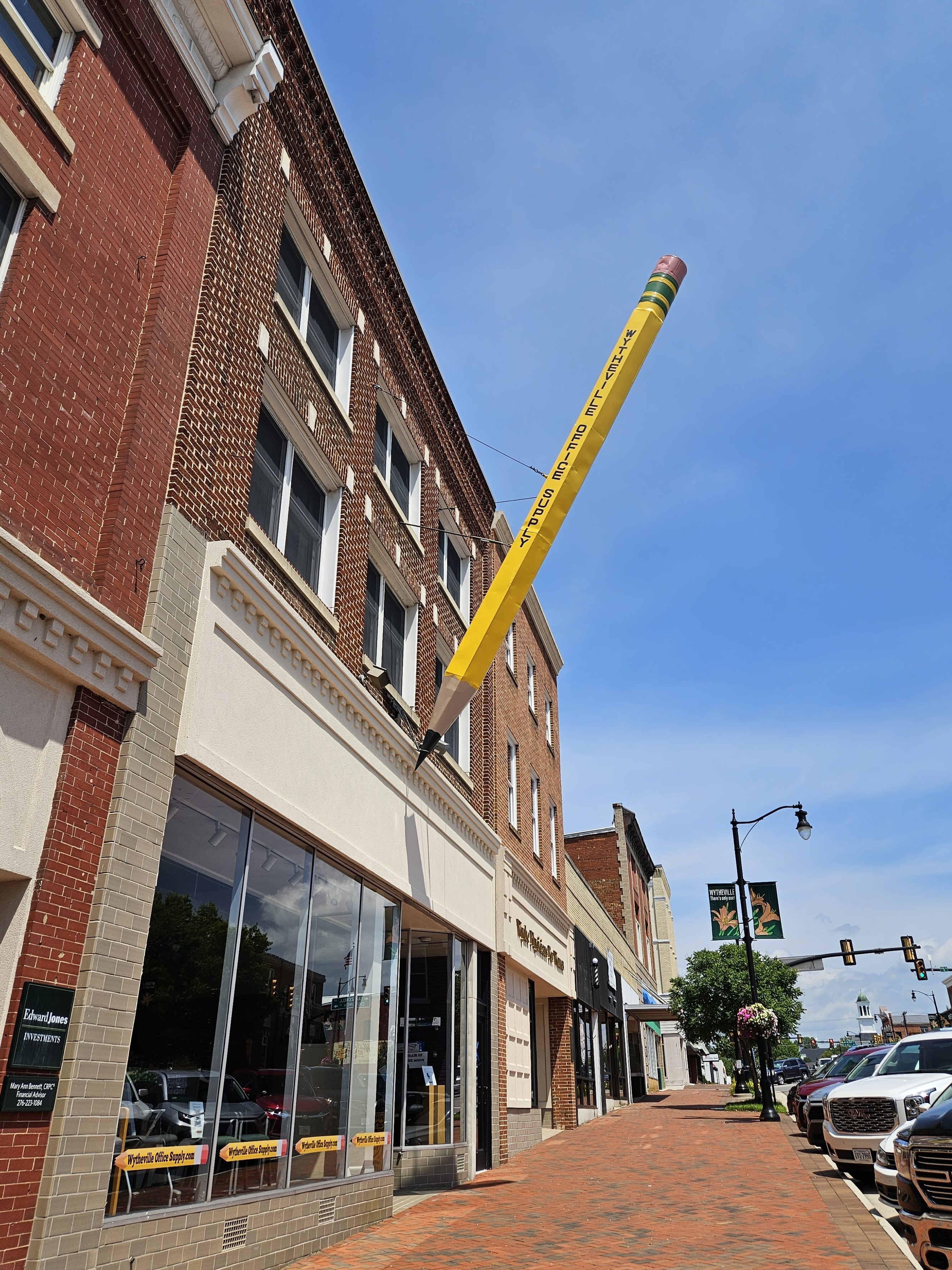 The alleyway brought us to Main Street, where we were met with the most iconic landmark in the town: the 30-foot-tall pencil outside of Wytheville Office Supply. Reminiscent of the nostalgic giant roadside attractions of yesteryear, the giant pencil has been delighting visitors for three quarters of a century. Though the store was closed when we visited, we made “a point” of photographing the enormous writing utensil.