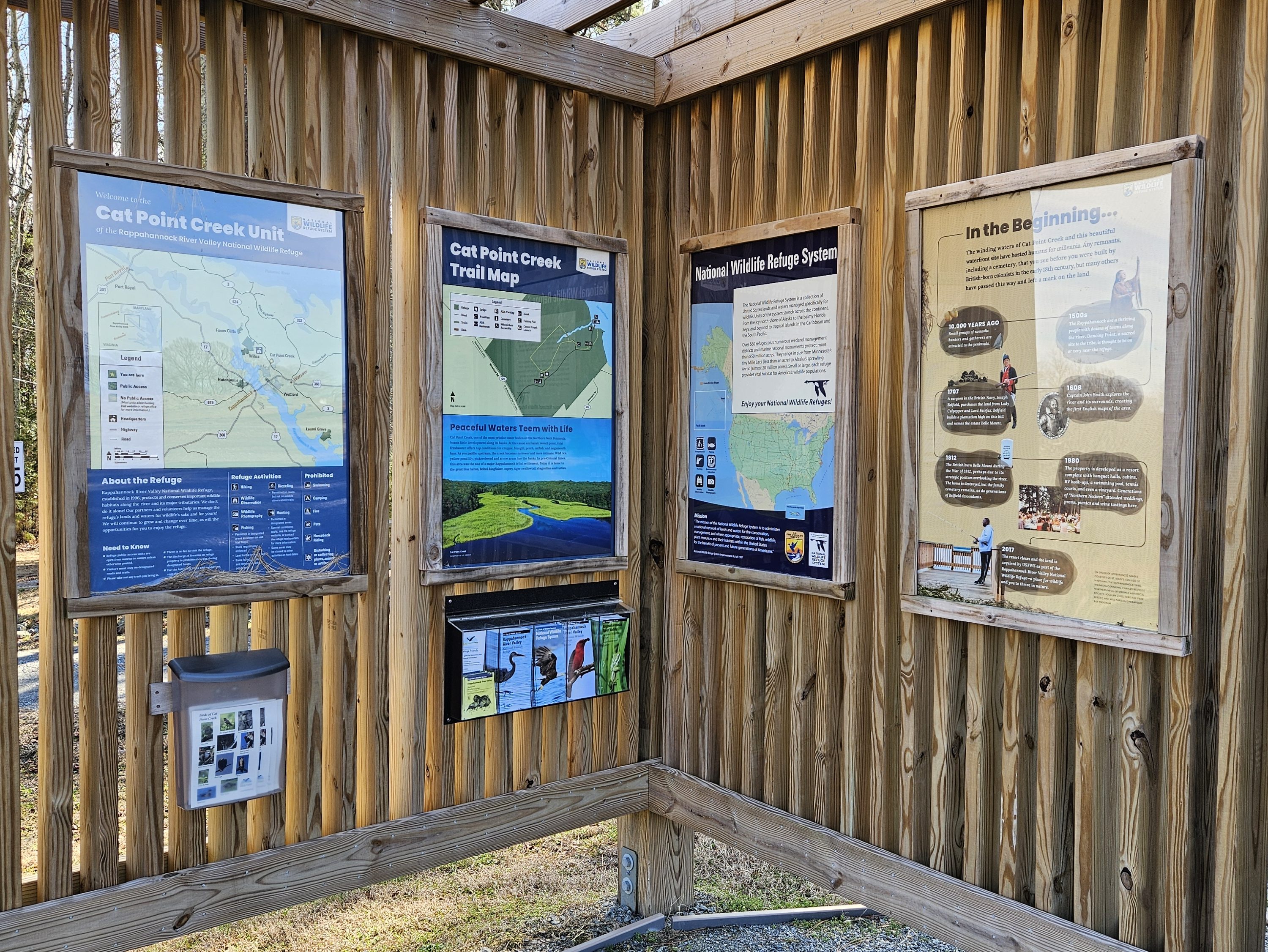 After making the turn into the property, we drove up the hill and parked in front of the large wooden meeting house, which was closed during our visit. Immediately to the right of the building is a kiosk with trail maps and interpretive signs. There, you can find information about the unit’s amenities (1.5 miles of trails, waterfront overlooks, kayak launches, a pavillion, seasonally open restrooms) and resident wildlife.